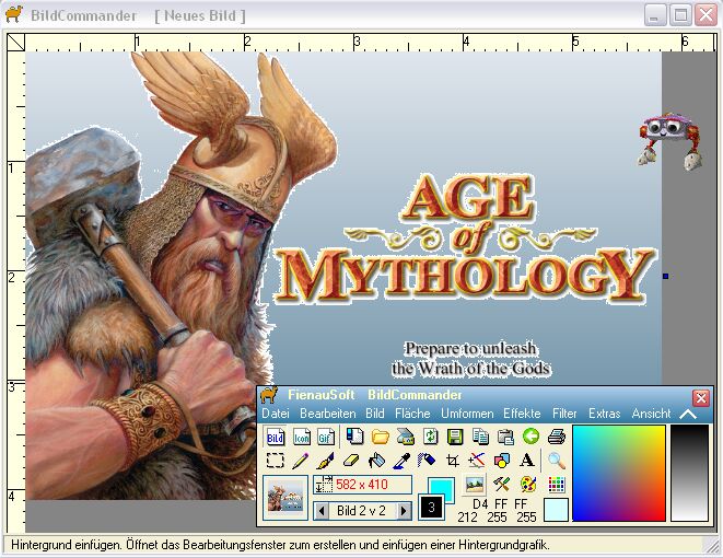 Mit dem BildCommander können Sie Hintergründe herstellen und hinter ein vorhandenes Bild legen. Voraussetzung dafür ist, daß der Hintergrund des Bildes durch die Farbe Weiß ersetzt wurde. Sie können auch erst den Hintergrund gestalten und dann das Bild mit dem weißen Hintergrund, wie schon beschrieben, ´drauflegen.